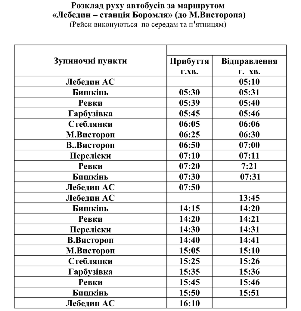 Рейсовий автобус курсує двічі на тиждень –щосереди і щоп’ятниці. А за умови стабільного пасажиропотоку, перевізник згоден здійснювати рейс ще і щопонеділка. Варто також зазначити, що громадяни, які мають право на пільговий проїзд у громадському транспорті, можуть їздити безкоштовно цим рейсом, адже виконавчим комітетом Лебединської міської ради забезпечено відшкодування компенсаційних виплат за пільговий проїзд окремих категорій громадян.