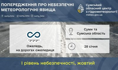 За повідомленням Сумського обласного центру з гідрометеорології, 28 січня на території Сумської області очікується ожеледь, на дорогах збережеться ожеледиця (І рівень небезпечності, жовтий)