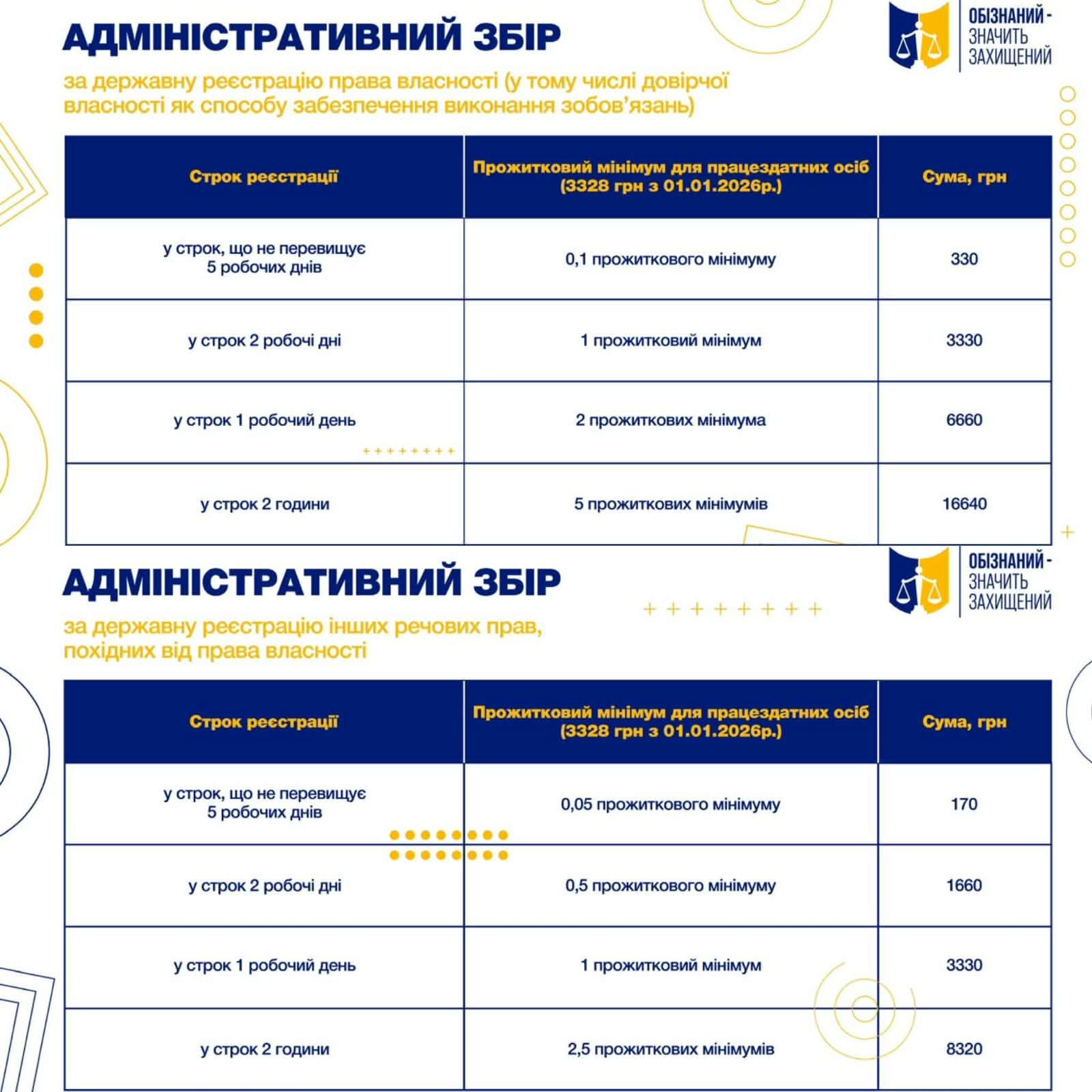 https://itd.rada.gov.ua/billinfo/Bills/Card/57325 Відповідно, з початку нового року змінюється розмір адміністративного збору за надання послуг, зокрема у сфері державної реєстрації речових прав на нерухоме майно.