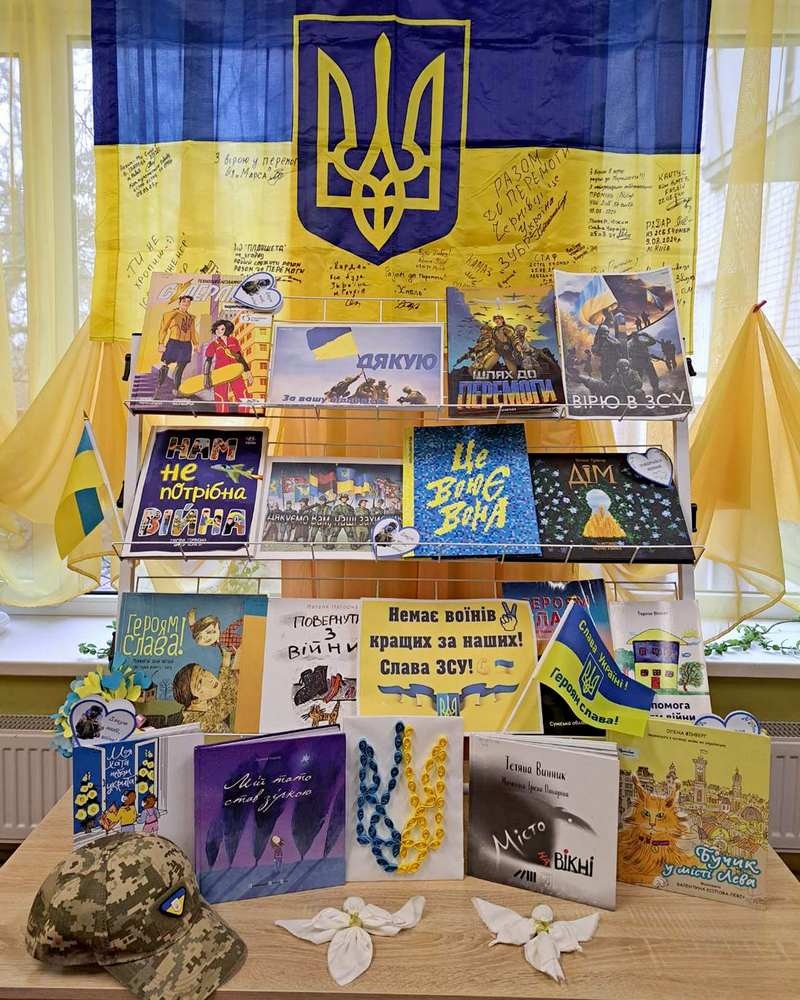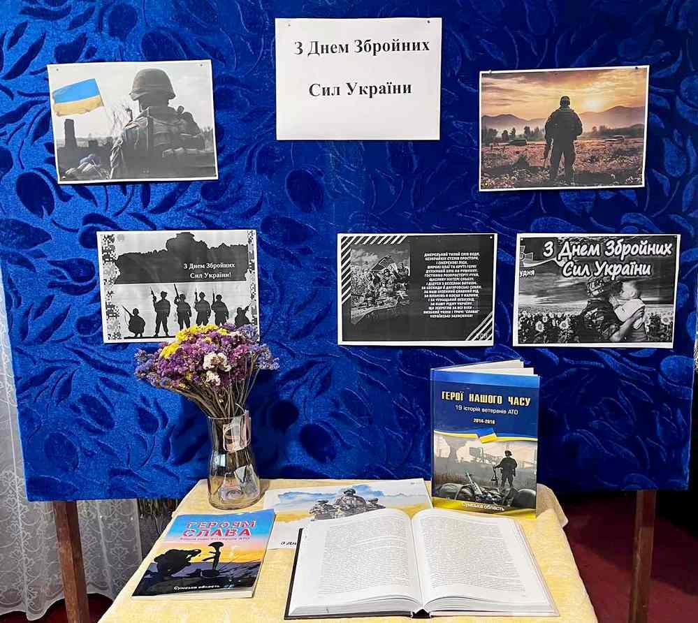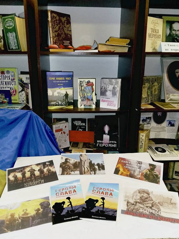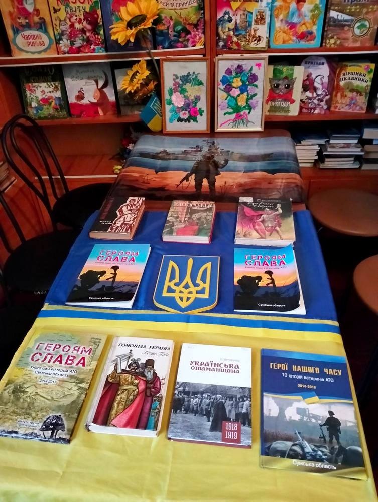 У книгозбірнях оформлено книжкові виставки та перегляди тематичної літератури: «ЗСУ - міць , сила і гордість України» (міська бібліотека №2), «Збройні сили України - слава, гордість, міць країни» (Лебединобобрицька СБФ), «Мужність та відвага крізь віки» (Ворожбянська СБФ), «Збройні сили України: від витоків до сьогодення» (Гринцівська СБФ), «Слава Україні! Героям слава!» (міська бібліотека №3), «Немає воїнів кращих за наших! Слава ЗСУ!» (центральна міська бібліотека), «Герої на варті України» (Будильська СБФ), «Герої нашої держави» (Катеринівська СБФ), «Героям слава!» (міська бібліотека №1).