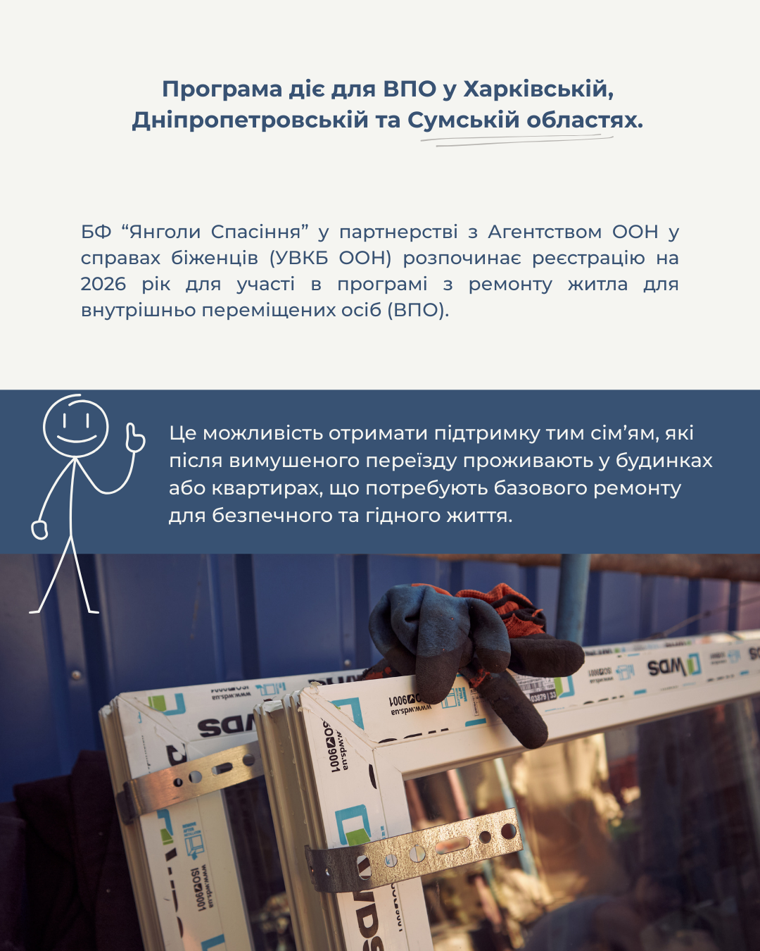 Благодійний фонд “Янголи Спасіння” спільно з Агентством ООН у справах біженців в Україні (УВКБ ООН) розпочинає реєстрацію внутрішньо переміщених осіб на 2026 рік для участі в програмі з ремонту житла. Програма діє для ВПО, які проживають на території Дніпропетровської, Харківської та Сумської областей.