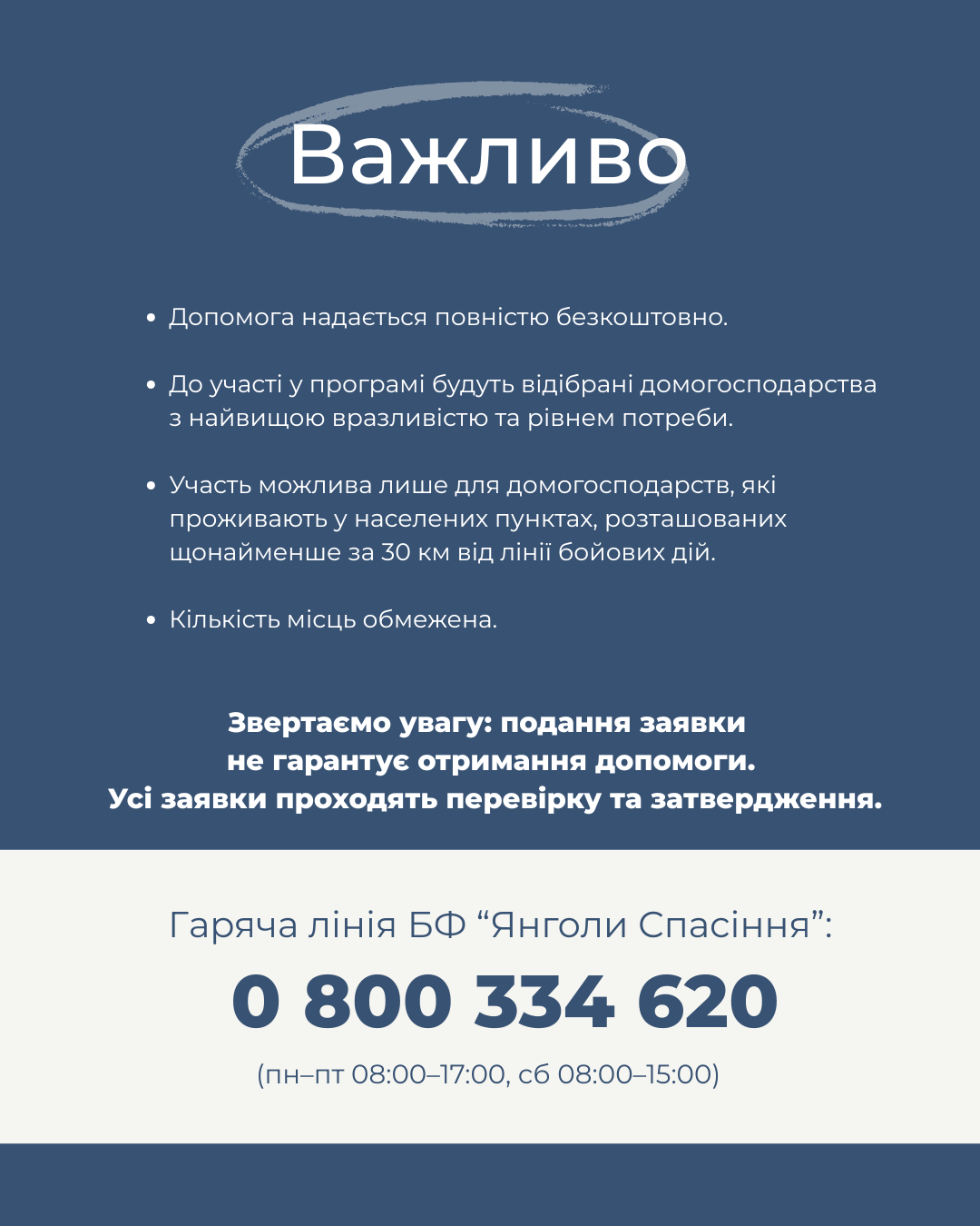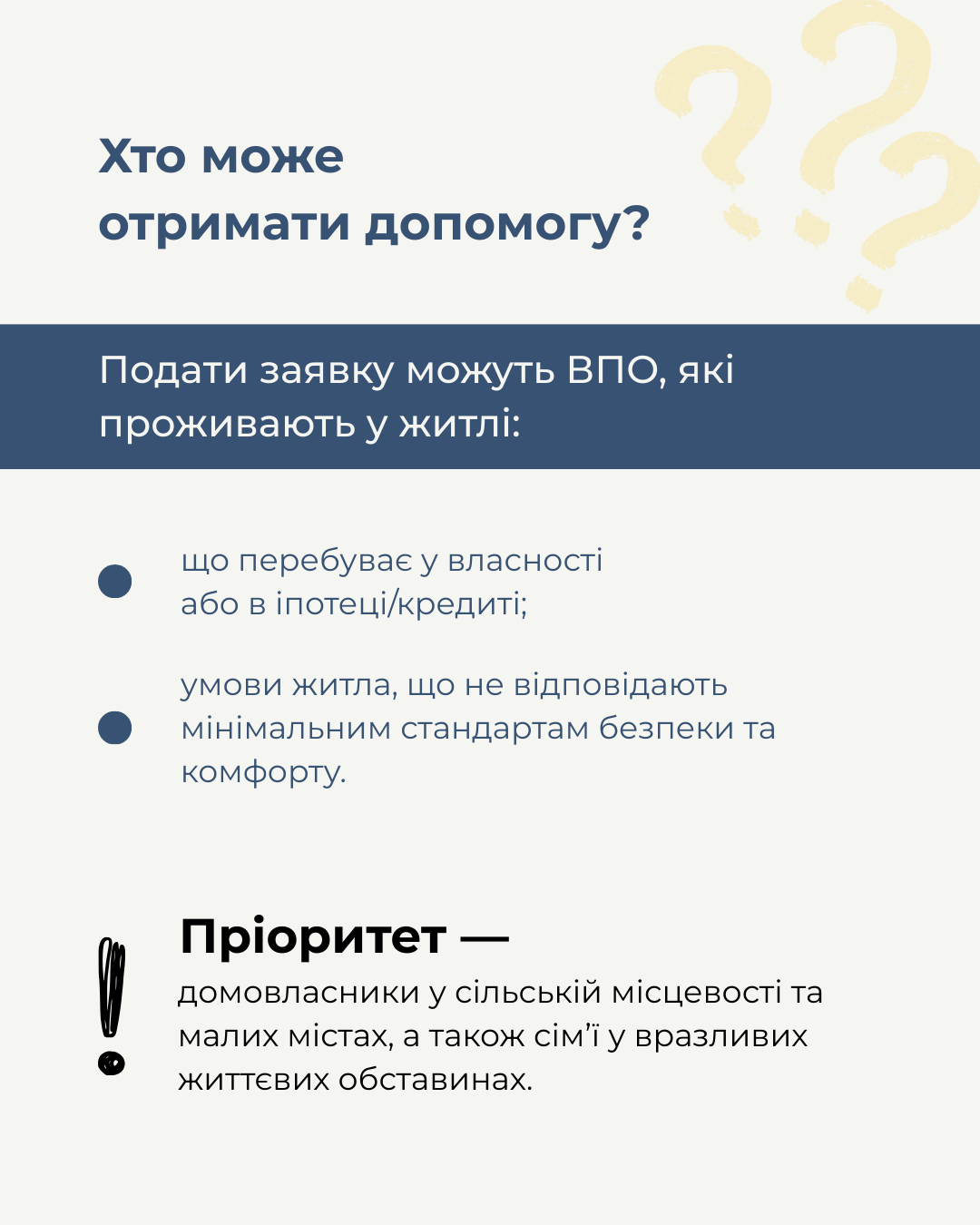 Пріоритет надають домовласникам у сільській місцевості та малих містах, а також сім’ям у вразливих життєвих обставинах.