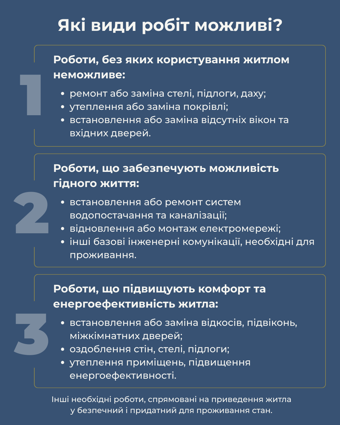 Допомога охоплює найнеобхідніші види ремонту, щоб зробити житло безпечним і зручним, а саме: вікна, двері, дах, підлога, утеплення, вода, електрика, каналізація та інші базові ремонти.