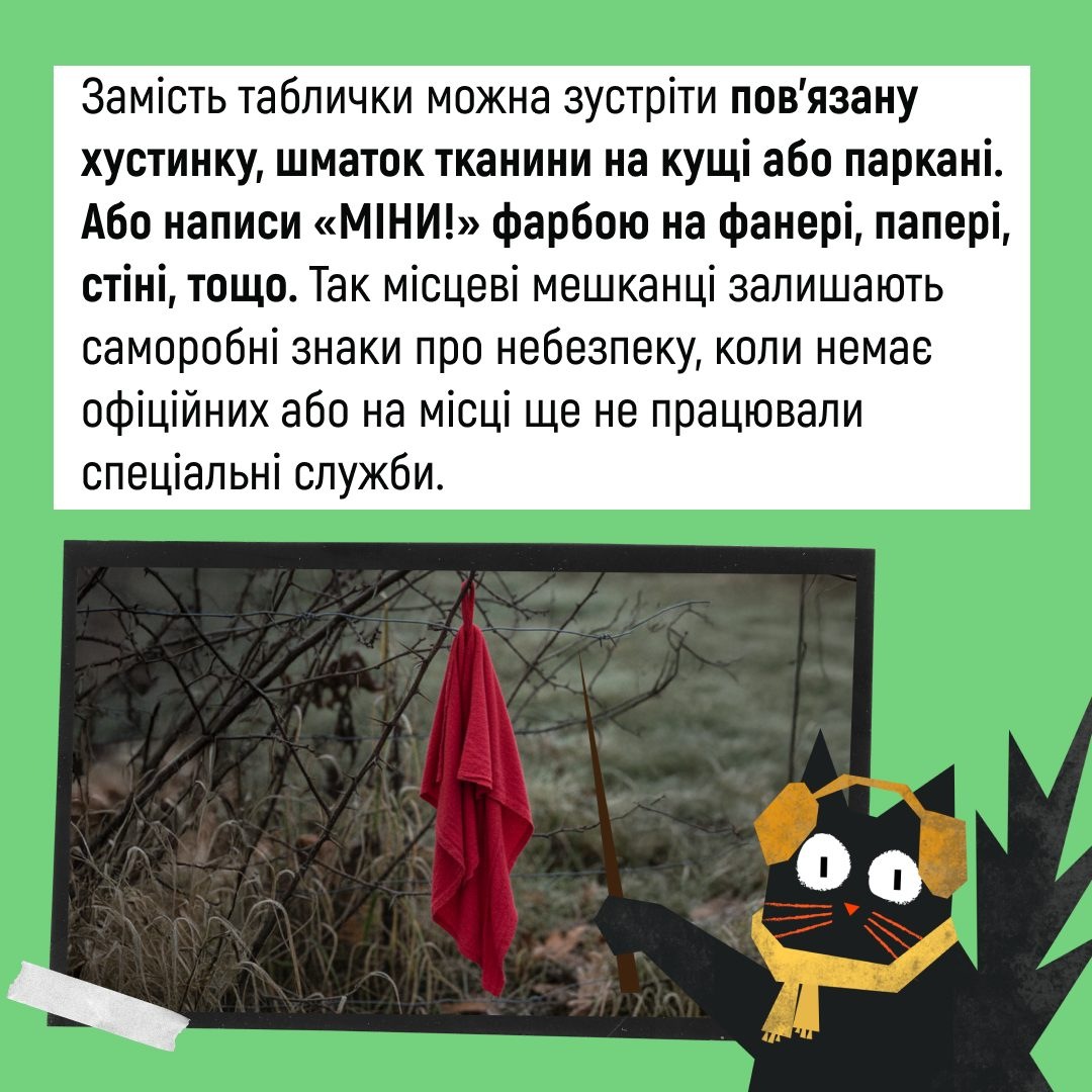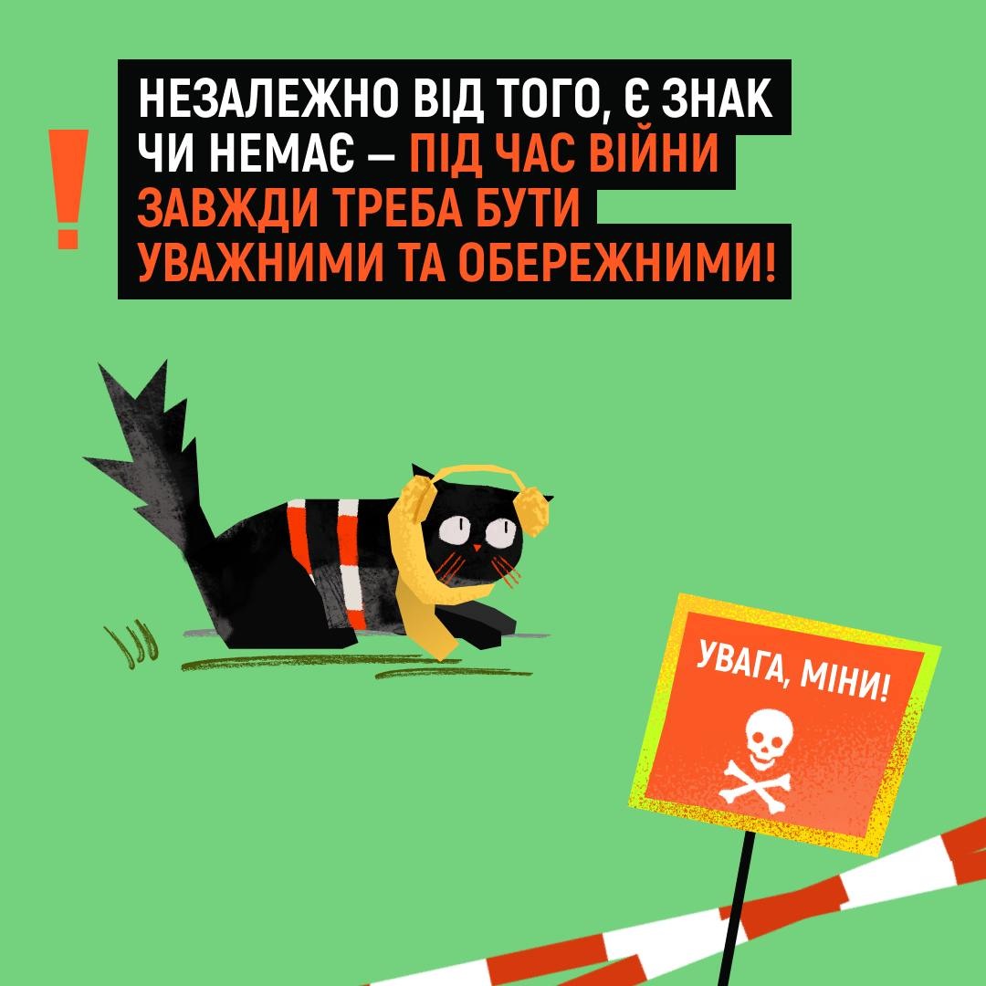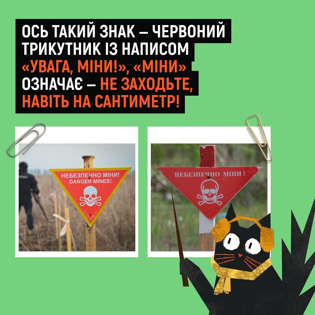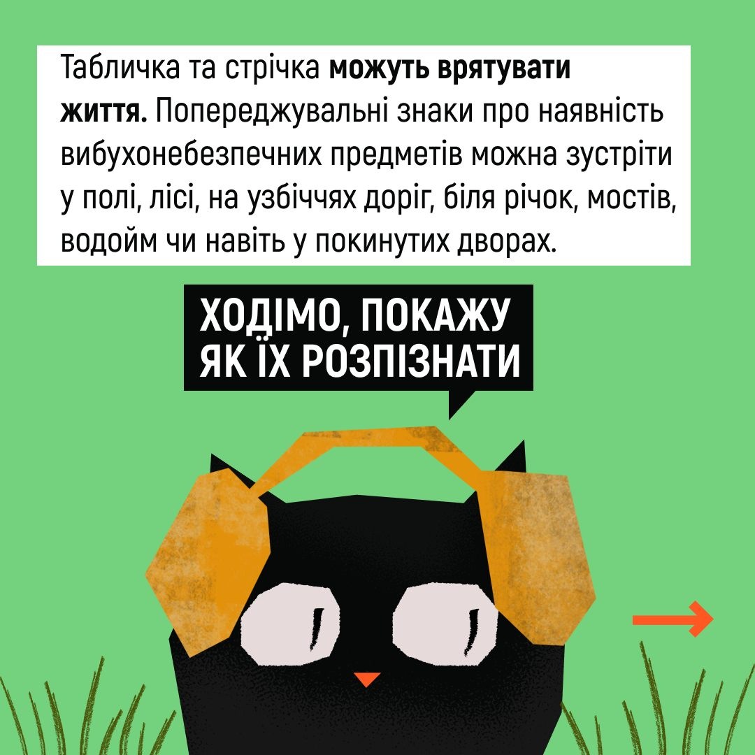 Гортайте картки, щоб разом з котом Нечіпуном впізнати усі знаки мінної небезпеки. Подивіться їх разом із дітьми: це хороший спосіб нагадати їм про правила поводження із підозрілими предметами.