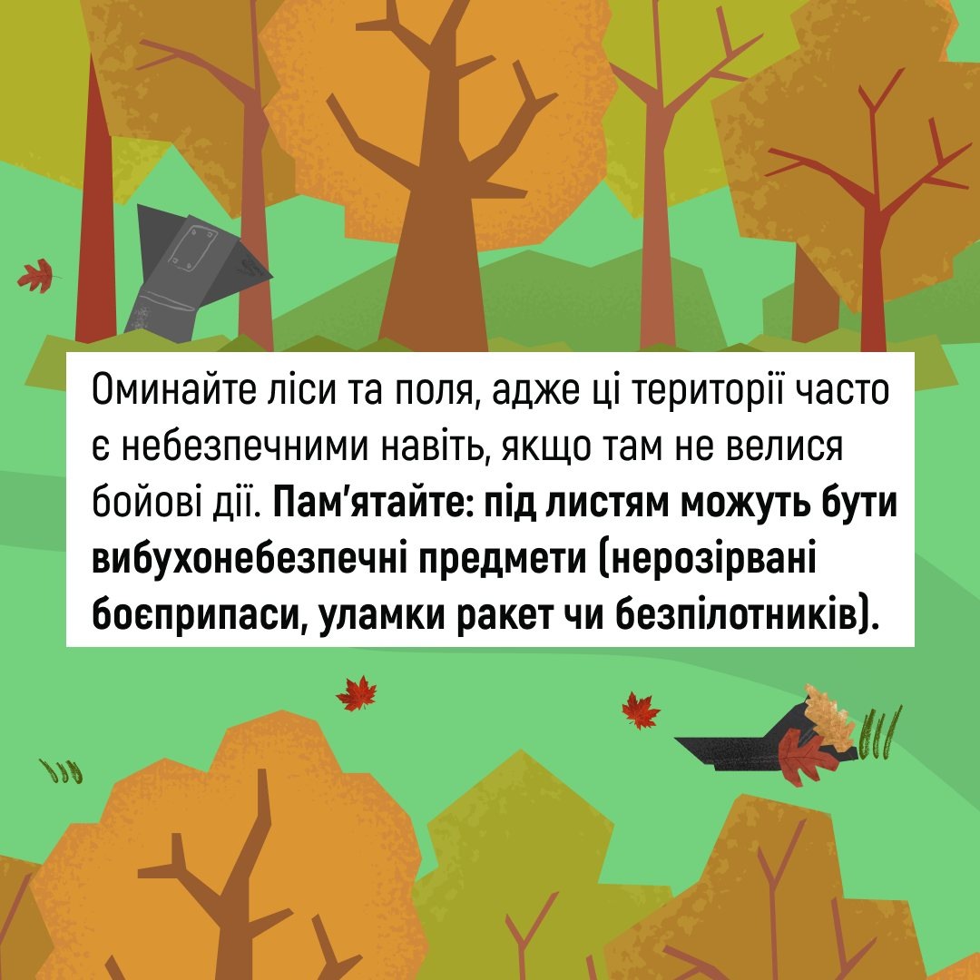 Осінь — це час затишку, спокою та особливої краси, що надихає вирушати на прогулянки мальовничими стежками Лебединської громади. Проте в умовах воєнного стану навіть звичні маршрути можуть приховувати небезпеку. Тому кожному варто пам’ятати про власну безпеку та уважно ставитися до навколишньої обстановки.