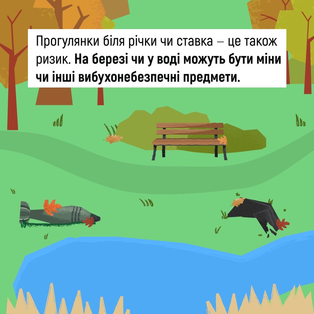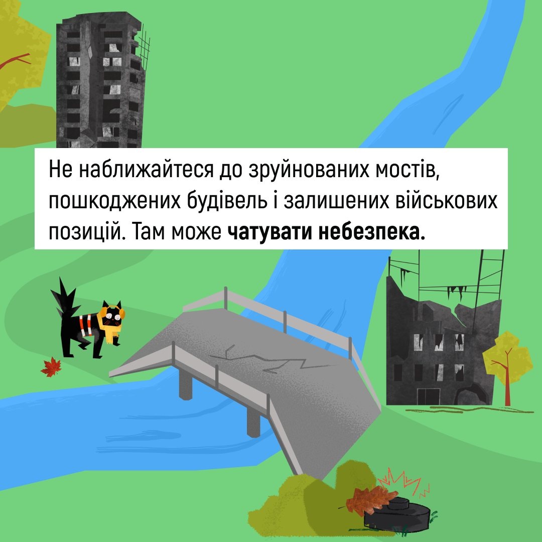 У тематичних картках нижче подано ключові поради, які допоможуть розпізнати небезпечні місця та уникнути ризиків. Дотримання цих простих правил збереже ваше здоров’я та життя. Бережіть себе та своїх близьких!