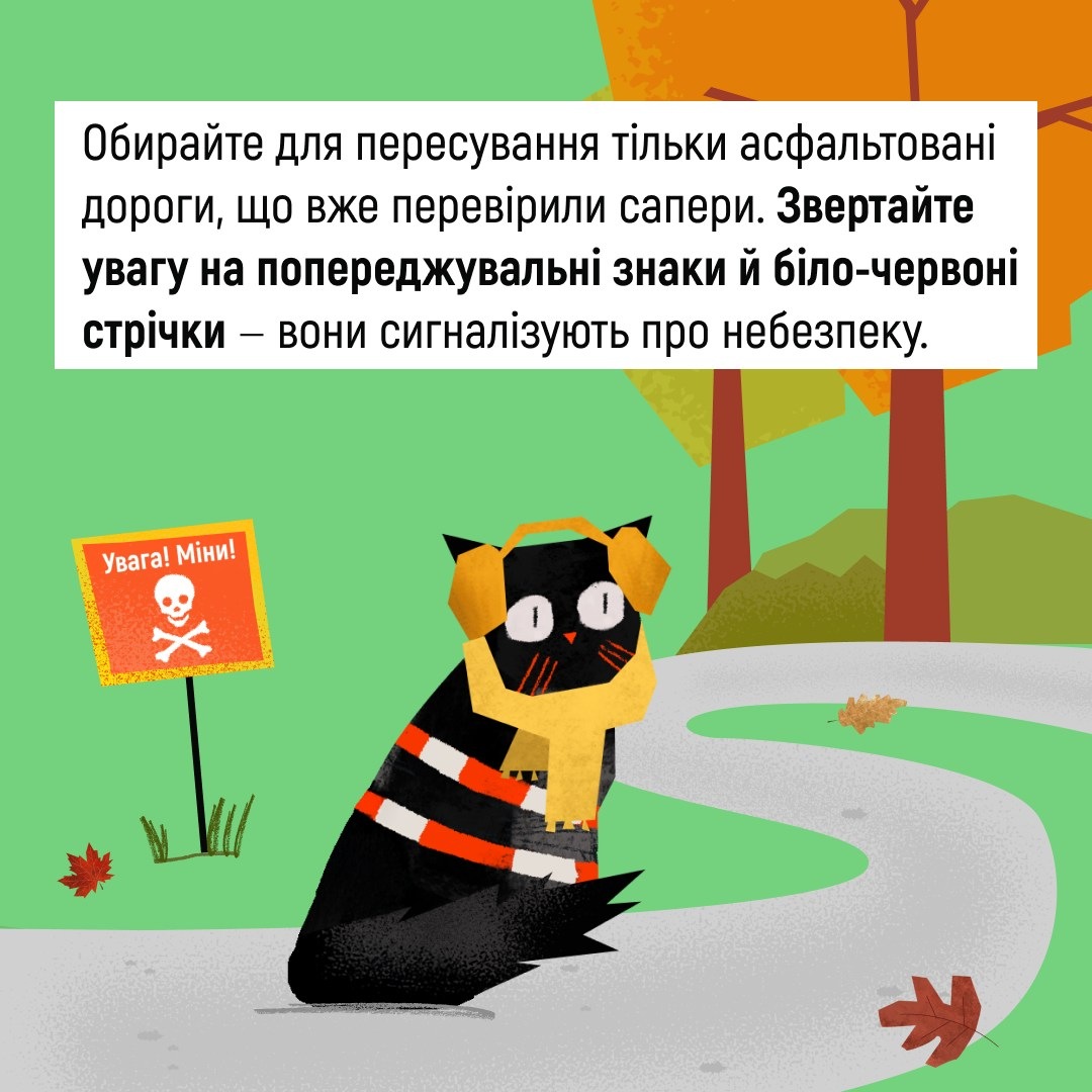 Під час пересування містом чи за його межами уникайте потенційно небезпечних ділянок, звертайте увагу на попереджувальні знаки та будь-які підозрілі предмети. Важливо знати, як виглядають зони, що можуть бути замінованими або пошкодженими внаслідок обстрілів, та не наближатися до них.