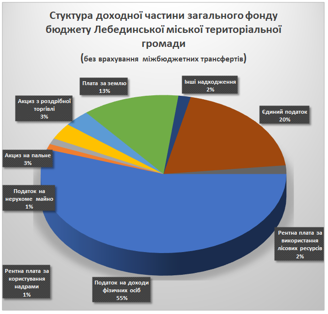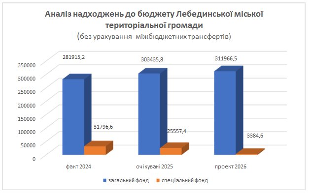 Обсяг доходної частини бюджету Лебединської міської територіальної громади (без врахування міжбюджетних трансфертів) у 2026 році очікується в сумі 479 839,7 тис. гривень, в т.ч. власні доходів загального фонду – 311 966,5 тис. гривень, доходів спеціального фонду 3 384,6 тис. гривень (в т.ч. бюджет розвитку – 921,3 тис. гривень). Прогнозні показники власних доходів загального фонду бюджету громади на 2026 рік (без трансфертів) в порівнянні з очікуваним виконанням 2025 року збільшуються на 8 530,7 тис. гривень, або на +2,8 %.