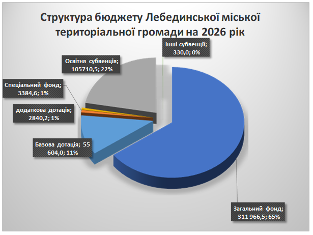 Бюджет Лебединської міської територіальної громади на 2026 рік обраховано на базі основних прогнозних макропоказників економічного і соціального розвитку України, які враховують дії правового режиму воєнного стану, та із застосуванням чинного бюджетного та податкового законодавства, Закону України «Про Державний бюджет України на 2026 рік» та основних прогнозних показників економічного та соціального розвитку Лебединської міської територіальної громади на 2026 рік.