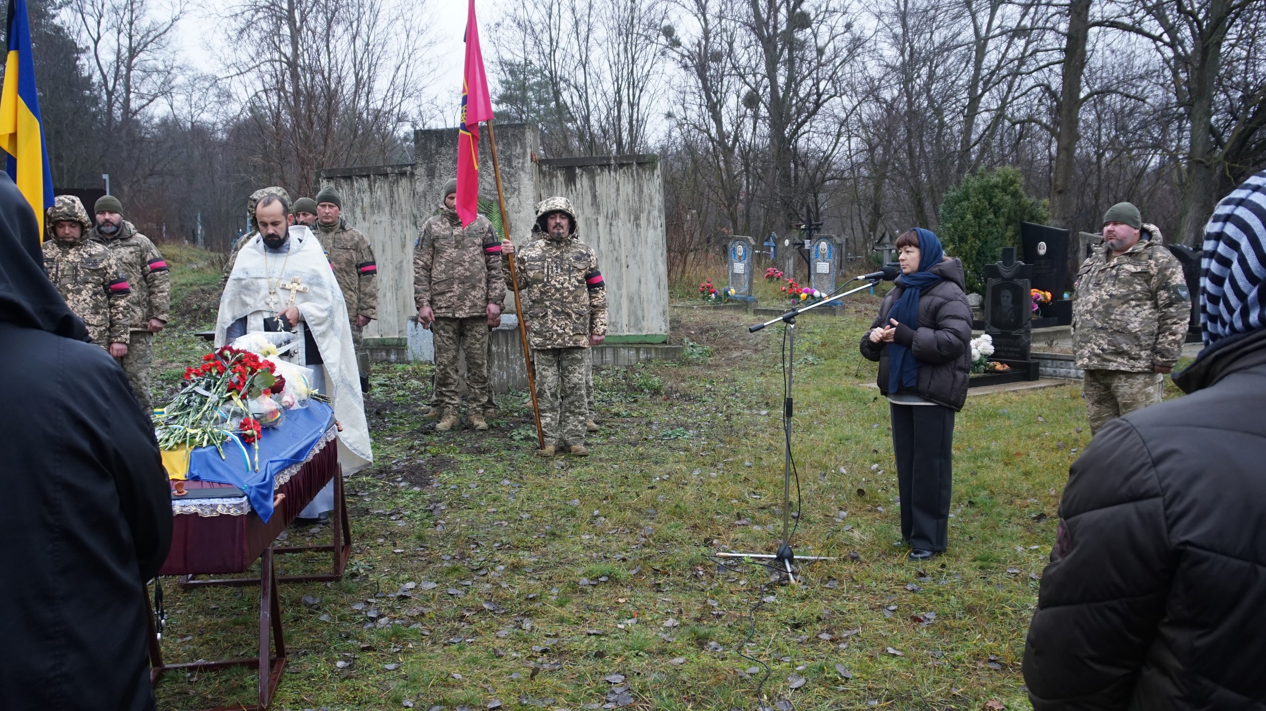 На місці поховання виступили перший заступник міського голови Ольга Зікєєва, начальник ІІ відділу Сумського РТЦК та СП (м. Лебедин) підполковник Ігор Ячменьов, староста Межиріцького старостинського округу Олексій Шкурко.