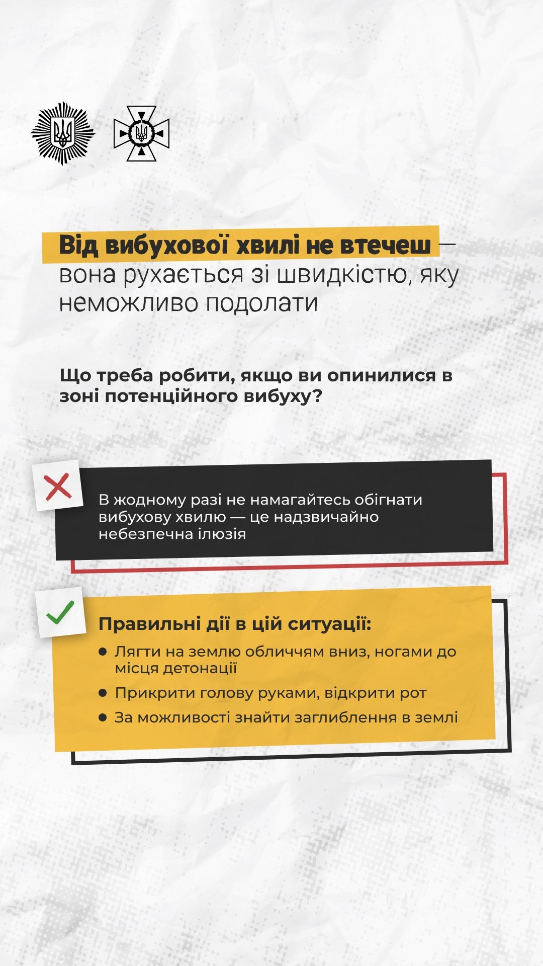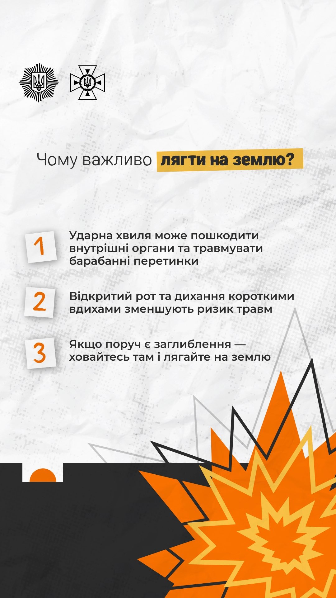 Найкращий спосіб вберегти себе — сховатися за твердим укриттям або лягти на землю, прикривши голову руками.