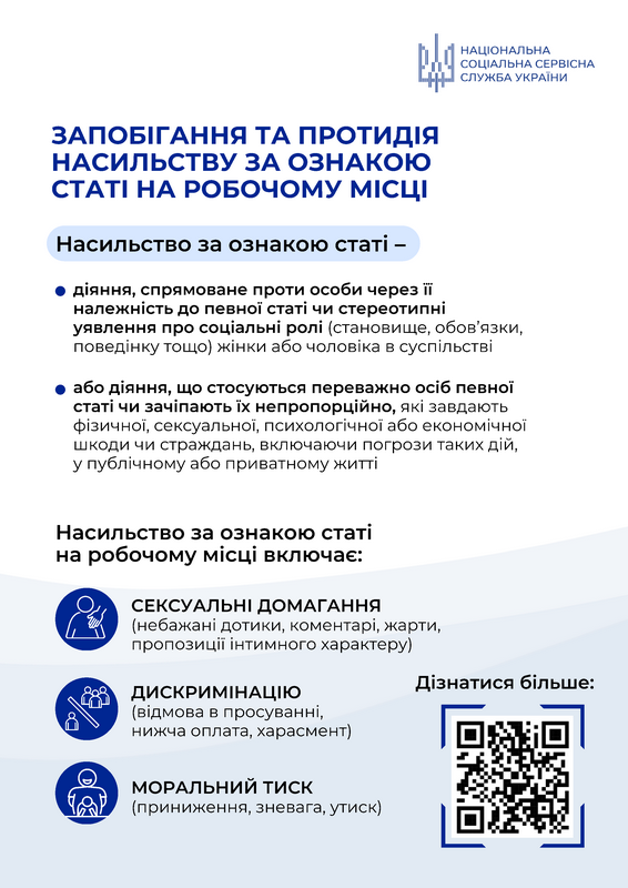 Національна соціальна сервісна служба України розробила інформаційну пам’ятку щодо запобігання та протидії насильству за ознакою статі на робочому місці, у якій висвітлено: