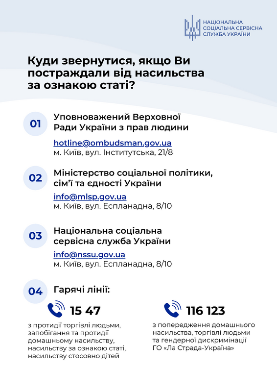 0 800 213 103 (цілодобово, безкоштовно) - Національна гаряча лінія з попередження домашнього насильства, торгівлі людьми та ґендерної дискримінації: