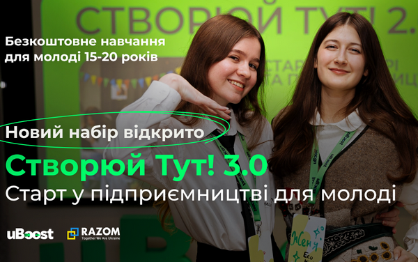 Приєднуйся до “Створюй ТУТ! 3.0” — безкоштовної навчальної програми від uBoost для старту в підприємництві для молоді. Учасники вивчають підприємництво з нуля (генерація ідей, фінанси, маркетинг, продажі тощо) та розвивають свої навички для початку кар’єри (soft skills, AI, публічні виступи).
