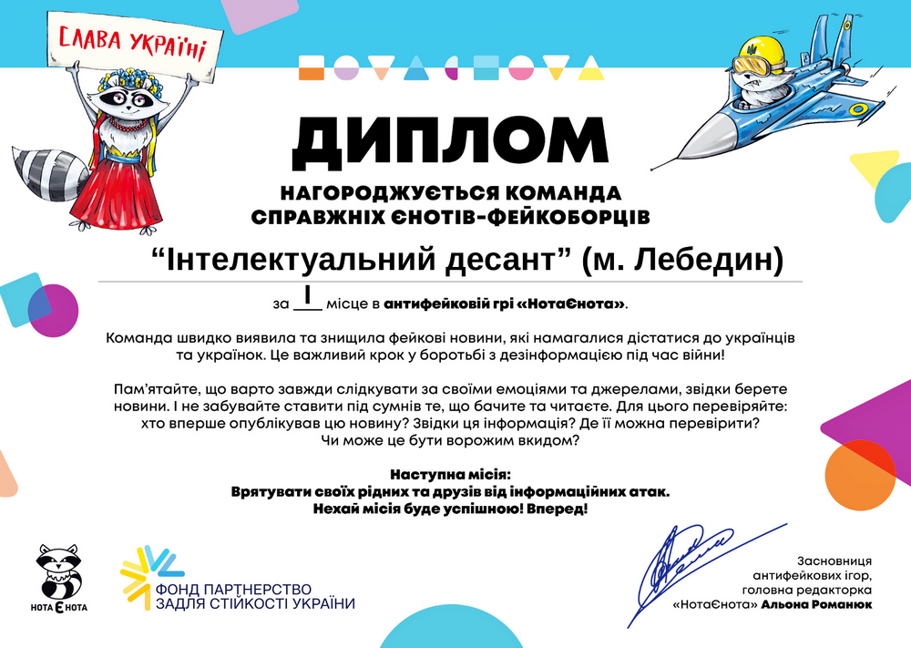 29 квітня команда «Інтелектуальний десант» Лебединського закладу загальної середньої освіти І–ІІІ ступенів №6 гідно представила громаду у всеукраїнській антифейковій інтелектуальній грі «НотаЄнота» та здобула перемогу серед сильних суперників.