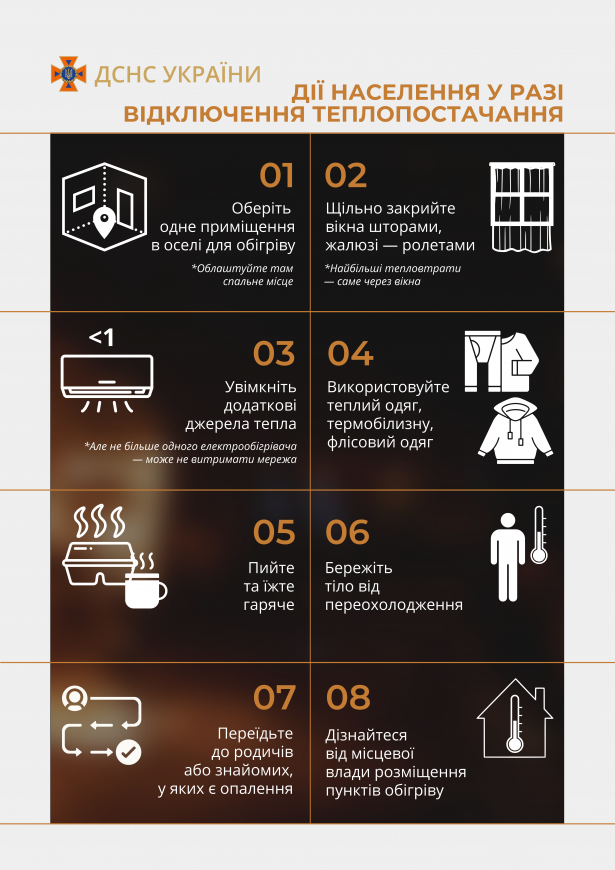 Оберіть одне приміщення в оселі для обігріву (Облаштуйте там спальне місце); Щільно закрийте вікна шторами, жалюзі — ролетами (Найбільші тепловтрати — саме через вікна); Увімкніть додаткові джерела тепла (Але не більше одного електрообігрівача — може не витримати мережа); Використовуйте теплий одяг, термобілизну, флісовий одяг; Пийте та їжте гаряче; Бережіть тіло від переохолодження; Переїдьте до родичів або знайомих, у яких є опалення; Дізнайтеся від місцевої влади розміщення пунктів обігріву.