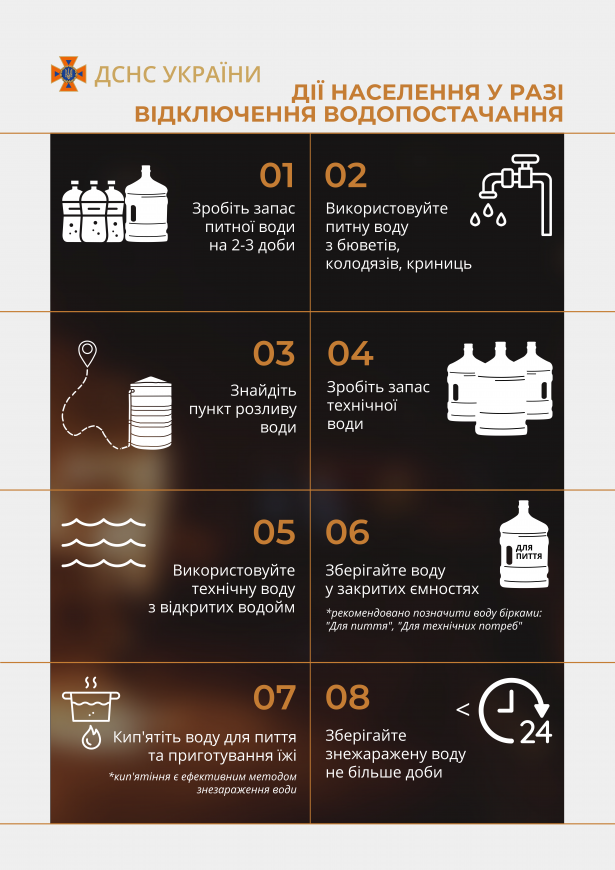 Зробіть запас питної води на 2-3 доби; Використовуйте питну воду з бюветів, колодязів, криниць; Знайдіть пункт розливу води; Зробіть запас технічної води; Використовуйте технічну воду з відкритих водойм; Зберігайте воду у закритих ємностях (Рекомендовано позначити воду бірками: "Для пиття", "Для технічних потреб"); Кип'ятіть воду для пиття та приготування їжі (Кип'ятіння є ефективним методом знезараження води); Зберігайте знезаражену воду не більше доби.
