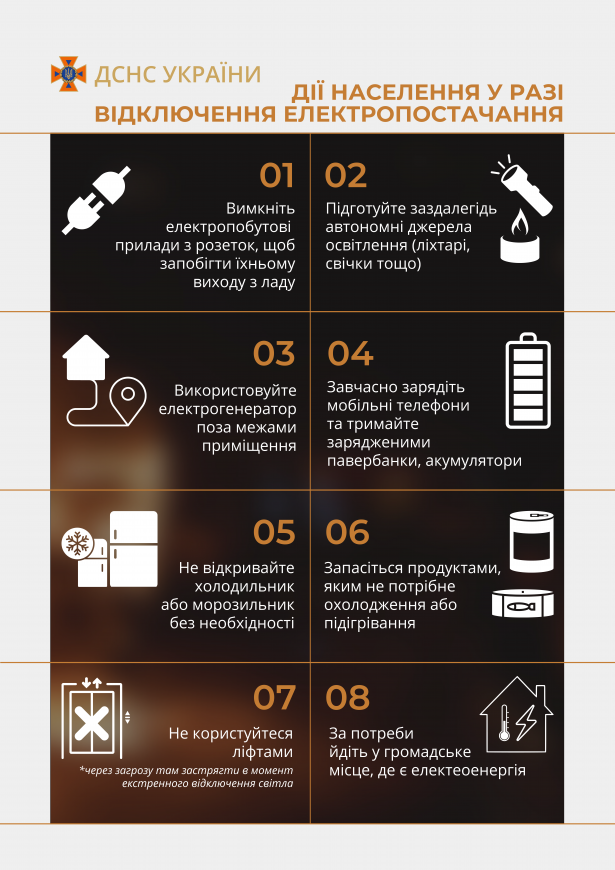 Вимкніть електропобутові прилади з розеток, щоб запобігти їхньому виходу з ладу; Підготуйте заздалегідь автономні джерела освітлення (ліхтарі, свічки тощо); Використовуйте електрогенератор поза межами приміщення; Завчасно зарядіть мобільні телефони та тримайте зарядженими павербанки, акумулятори; Не відкривайте холодильник або морозильник без необхідності; Запасіться продуктами, яким не потрібне охолодження або підігрівання; Не користуйтеся ліфтами (Через загрозу там застрягти в момент екстреного відключення світла); За потреби йдіть у громадське місце, де є електроенергія.
