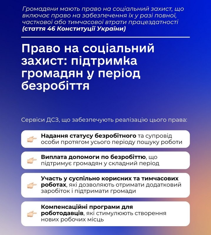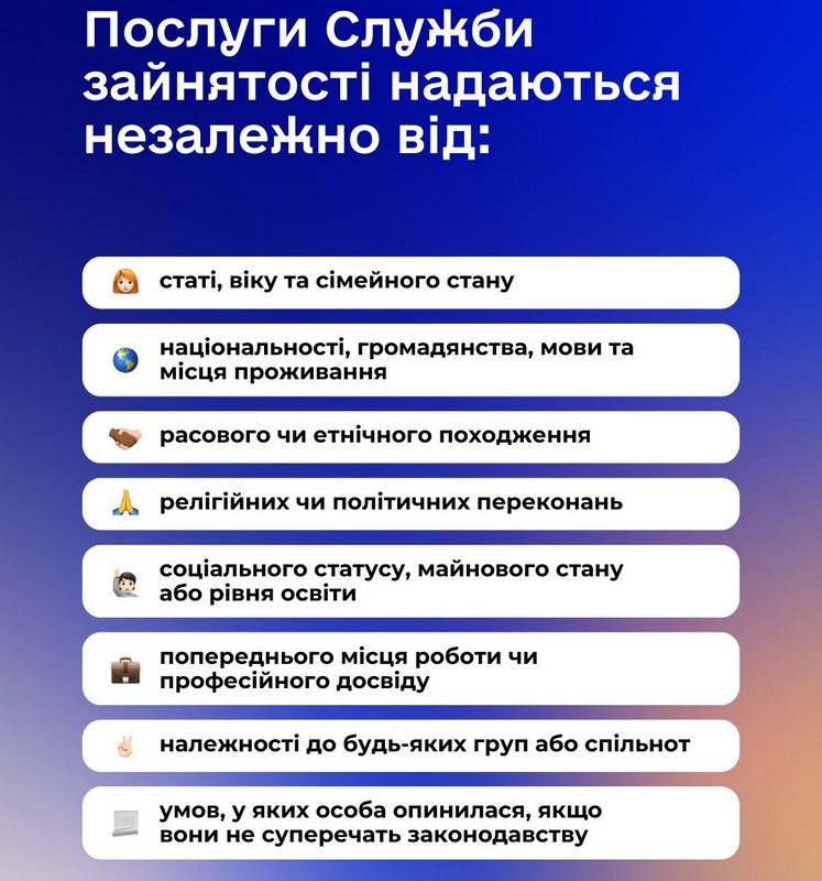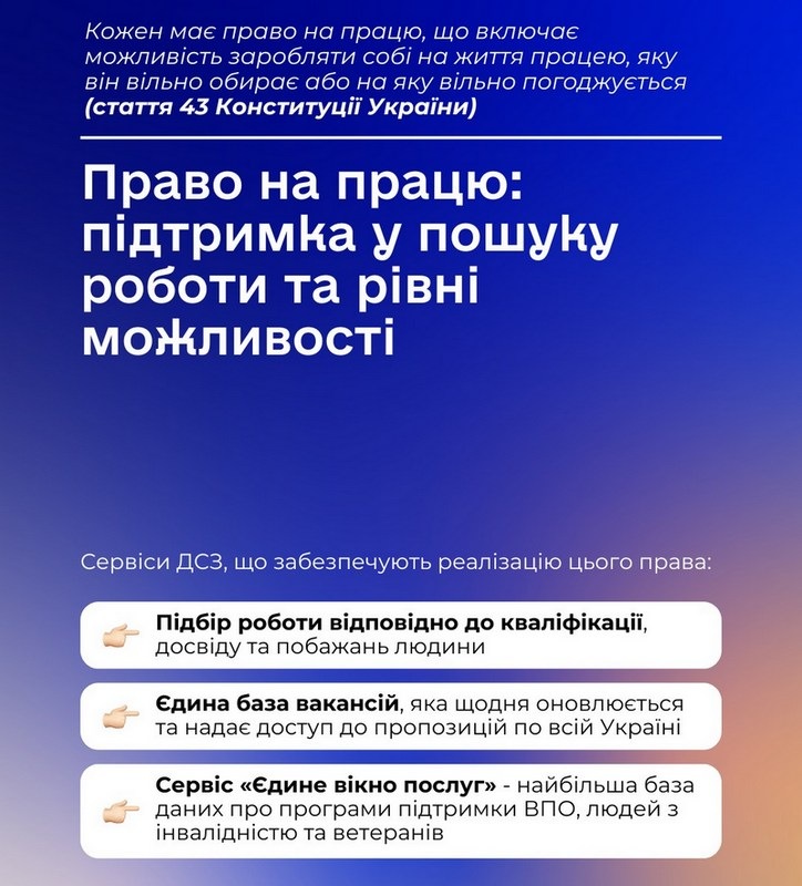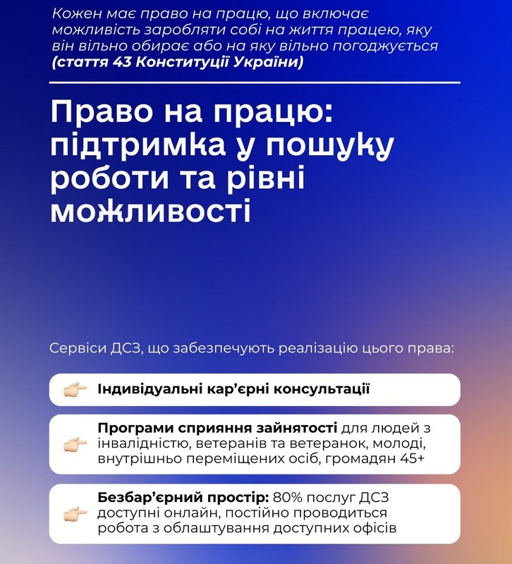 Державна служба зайнятості щодня працює над тим, щоб право на працю було не лише конституційною нормою, а й реальною можливістю для громадян. Наше завдання — створювати умови, у яких кожен може реалізувати свій професійний потенціал, отримати підтримку та відчувати захищеність.