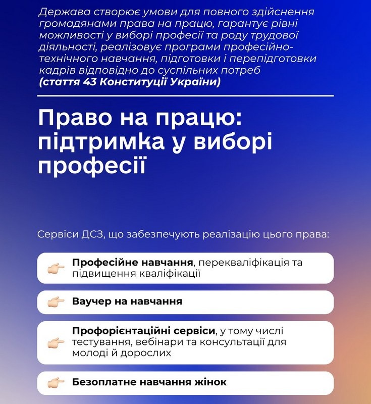 Держава створює умови для повного здійснення громадянами права на працю, гарантує рівні можливості у виборі професії та роду трудової діяльності, реалізовує програми професійно-технічного навчання, підготовки і перепідготовки кадрів відповідно до суспільних потреб (стаття 43 Конституції України).
