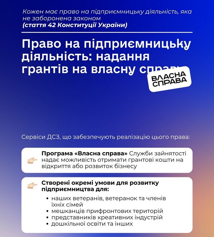 Кожен має право на підприємницьку діяльність, яка не заборонена законом (стаття 42 Конституції України).