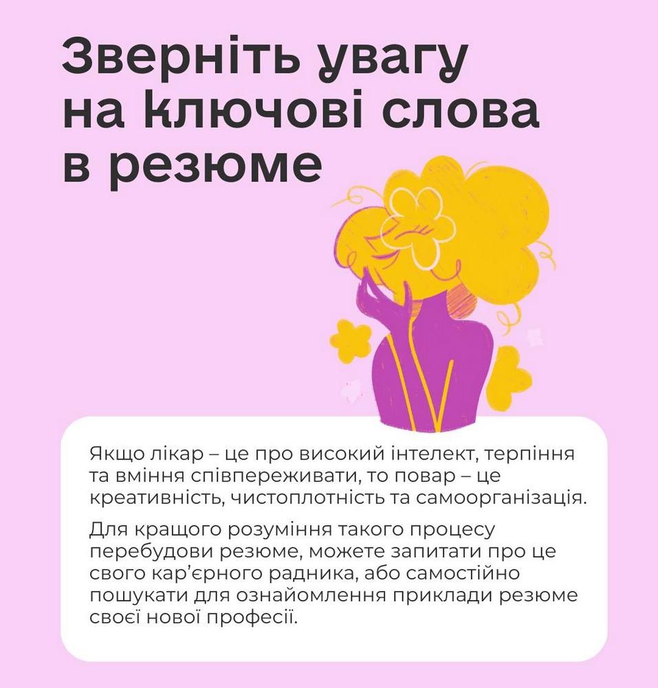 По-третє, необхідно звернути увагу на ключові слова в резюме. Якщо лікар – це про високий інтелект, терпіння та вміння співпереживати, то повар – це креативність, чистоплотність та самоорганізація. Бухгалтер – точність, відповідальність та стресостійкість. Крім того, вже в самому резюме варто використовувати термінологію нової професії. В дизайнера з’являться слова айдентика, UX/UI, естатика, юзабіліті, а у скульптора – барельєф, композиція, фактура. Для кращого розуміння такого процесу перебудови резюме, можете запитати про це свого кар’єрного радника, або самостійно пошукати для ознайомлення приклади резюме своєї нової професії.