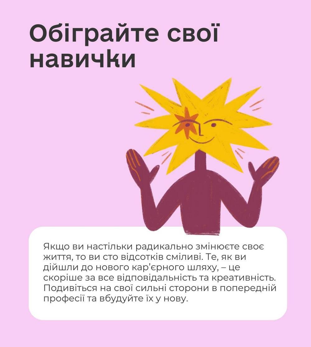 По-п’яте, обіграйте свої навички. Якщо ви настільки радикально змінюєте своє життя, то ви сто відсотків сміливі. Те, як ви дійшли до нового кар’єрного шляху, – це скоріше за все відповідальність та креативність. Подивіться на свої сильні сторони в попередній професії та вбудуйте їх у нову.