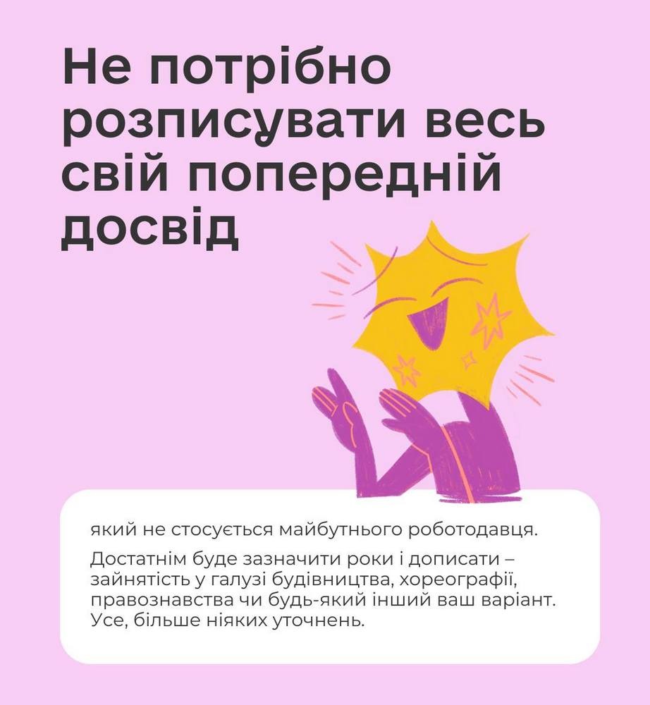Перше і найголовніше – не потрібно розписувати весь свій попередній досвід роботи в сферах, які не стосуються майбутнього роботодавця. Достатнім буде зазначити роки і дописати – зайнятість у галузі будівництва, хореографії, правознавства чи будь-який інший ваш варіант. Усе, більше ніяких уточнень.