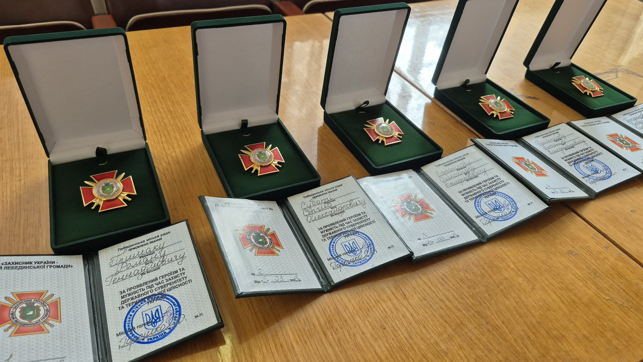 Саме ці п’ятеро захисників стали першими, кому присвоєно почесну відзнаку «Захисник України – Герой Лебединської громади».