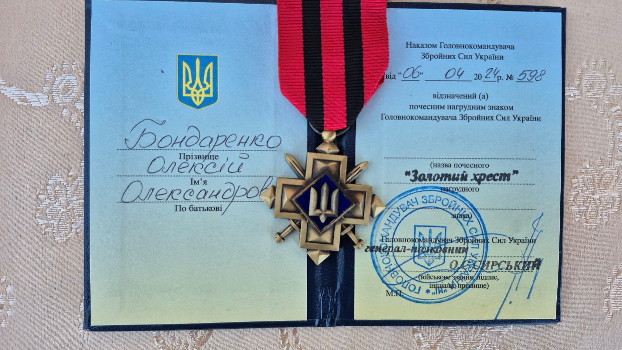 Володимир Шутько передав матері загиблого воїна — Олені Бондаренко — державну відзнаку від Головнокомандувача Збройних Сил України. Нагрудним знаком «Золотий Хрест» від Головнокомандувача ЗСУ генерал-полковника Олександра Сирського посмертно нагороджено Бондаренка Олексія Олександровича за мужність і самовіддану службу Україні.